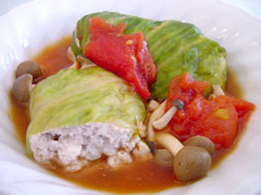 - EC の煮汁を沸かした中に、ロールレタスを並べ入れる。ホールトマトをくずして加え途中、アクを取りながら10分位コトコト煮る。ほぐしたしめじを加え1〜2分位煮て仕上げる。