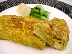 半熟状にする。フライパンをゆすりながら片方に寄せ、裏返す。
