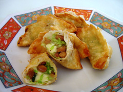 B 餃子を包む要領で、Aの具を餃子の皮で包む。