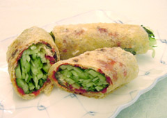 きゅうりを芯にして、端からくるくると巻いて、最後を A ののりで止める。