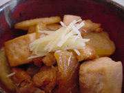 @ 大根は皮をむき、6〜7mm厚さのイチョウ切りにする。
