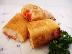 B Aを端からくるくる巻き、楊子で3ヶ所位止める。