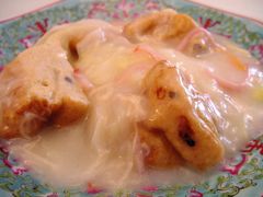 Bの水溶き片栗粉でとろみをつけ味を整え、器に盛りつける。