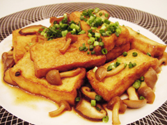 B Aの生揚げをフライパンの端に寄せ、きのこ類を炒める。